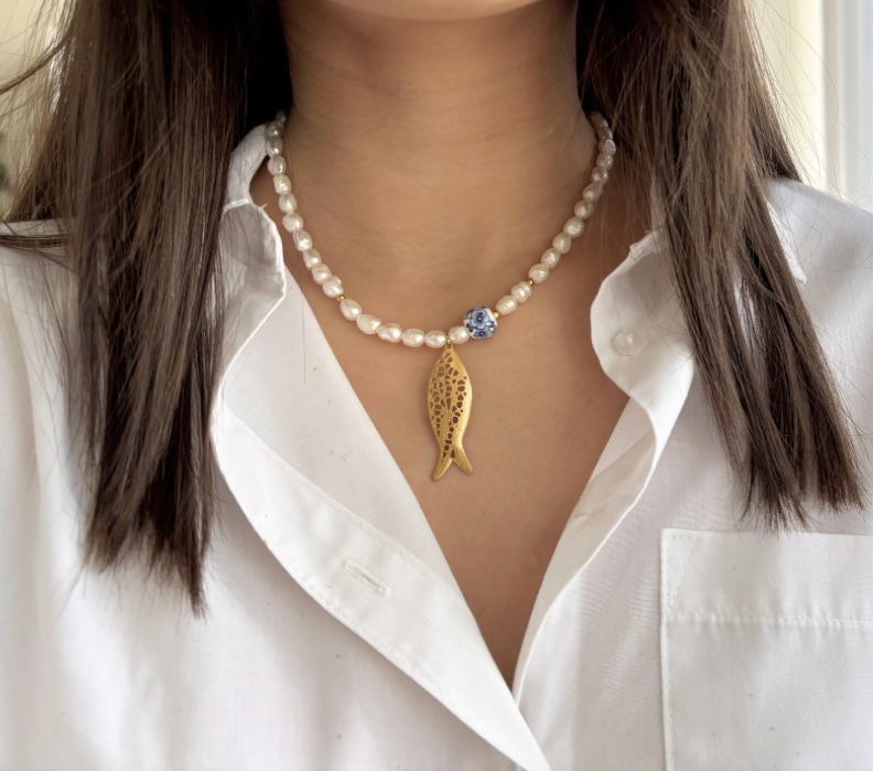 Colar Sardinha (pérolas água doce) 24,00 € Desconto de %. Partilhar Comprar Contactar Colar Sardinha com Pérolas de água doce e peça de cerâmica azulMaterial: aço inoxidável