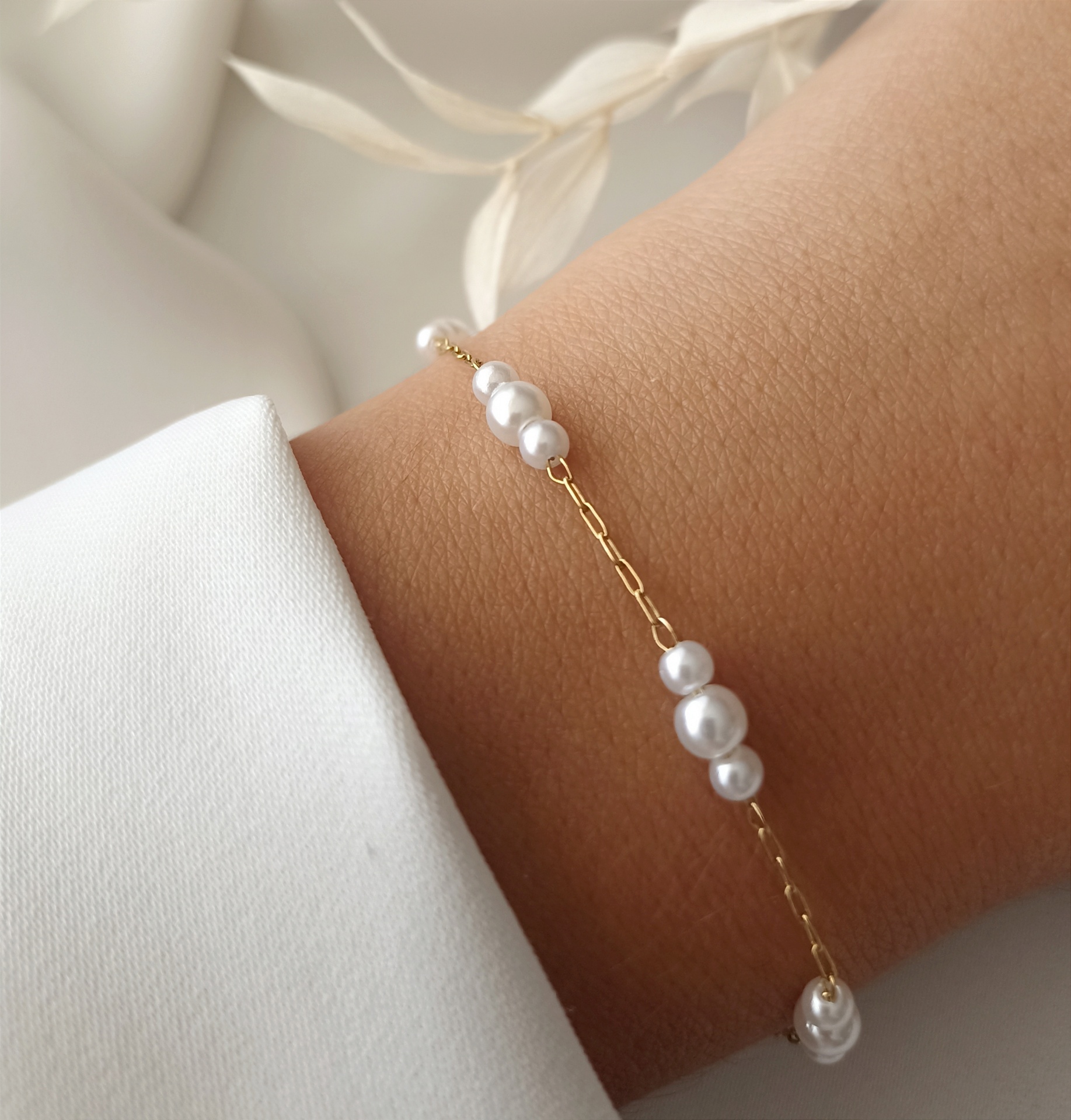 Pulseira com pérolas 6,00 € Desconto de %. Partilhar O produto encontra-se sem stock. Pulseira com pérolas - dourada Material: aço inoxidável Tamanho: 17cm + 3cm (extensão)
