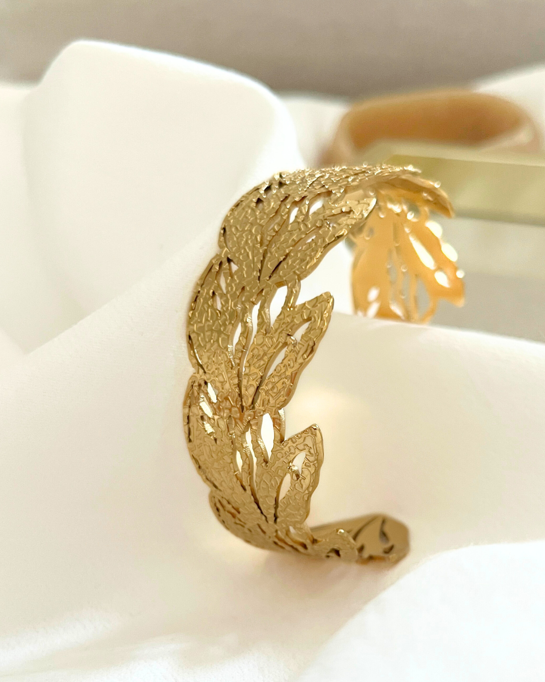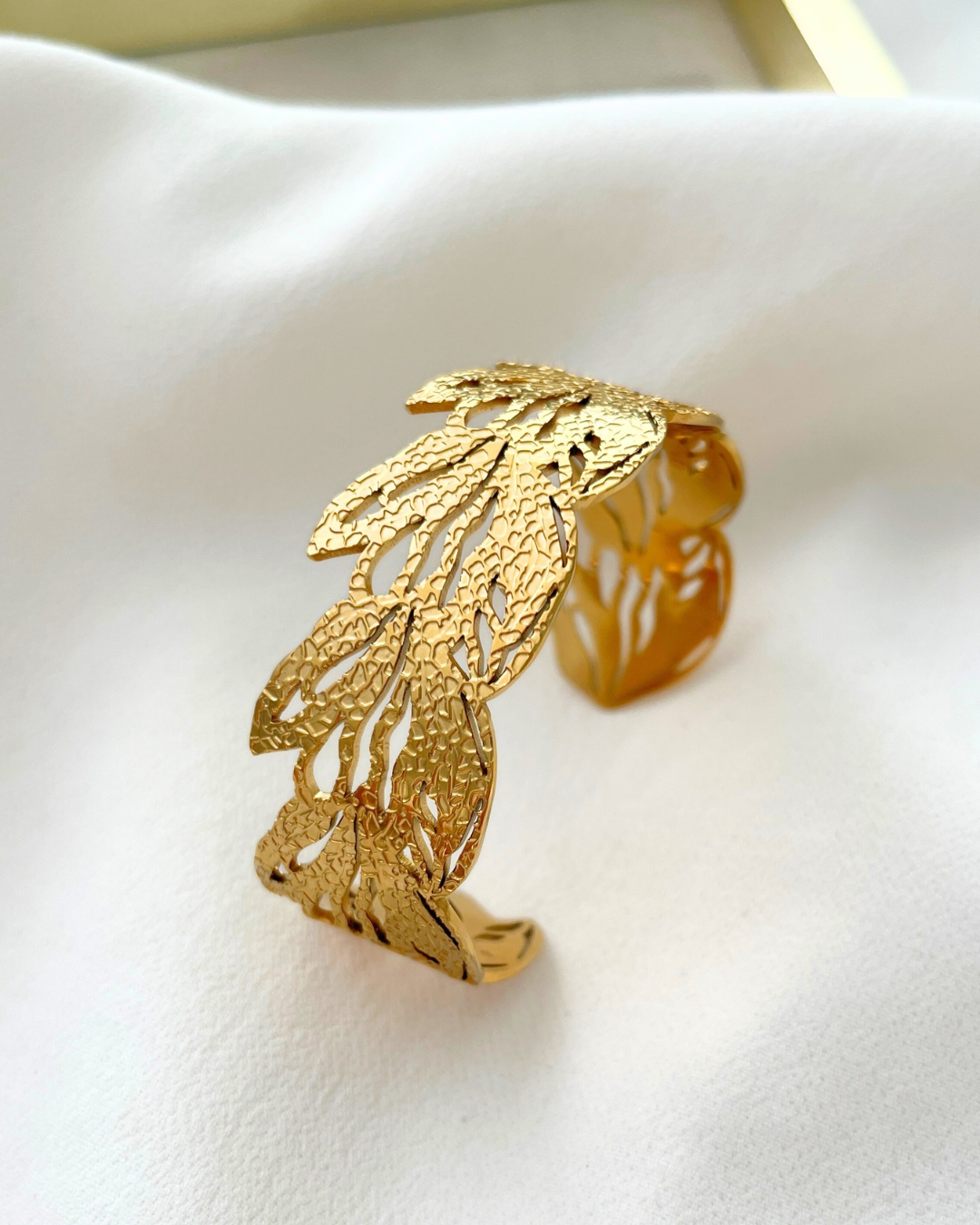 • Bracelete dourado recortado em forma de folhas sobre tecido branco